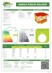 Asgari olarak binanın enerji ihtiyacı ve enerji tüketim sınıflandırması, yalıtım özellikleri ve ısıtma ve/veya soğutma sistemlerinin verimi ile ilgili bilgileri içeren belgedir.